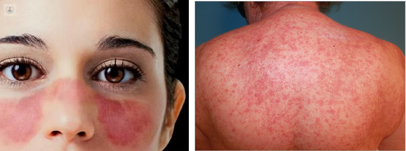 - Εξάνθημα στο πρόσωπο και στο σώμα, ειδικά μετά από έκθεση στον ήλιο